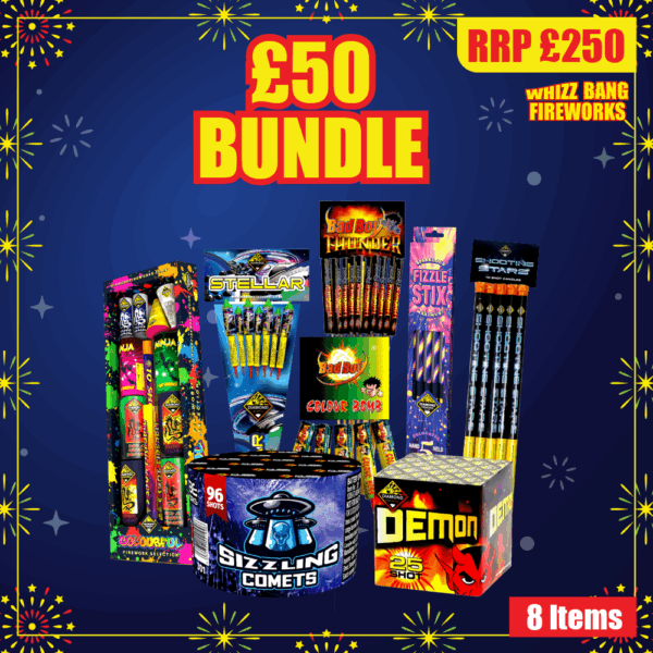 Light up the night with our £50 Firework Bundle, packed with an exciting mix of rockets, cakes, and a classic selection box – perfect for creating a spectacular display at great value.
